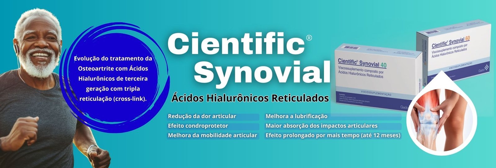 O Cientific Synovial representa a evolução da tecnologia de viscossuplementação. Sua principal diferença está na tecnologia de reticulação (cross-link), que cria uma molécula de ácido hialurônico 3 a 4 vezes maior e mais robusta que a dos suplementos convencionais. Isso resulta em uma permanência prolongada na articulação e uma ação lubrificante superior, oferecendo um alívio mais duradouro e eficaz com uma única aplicação.